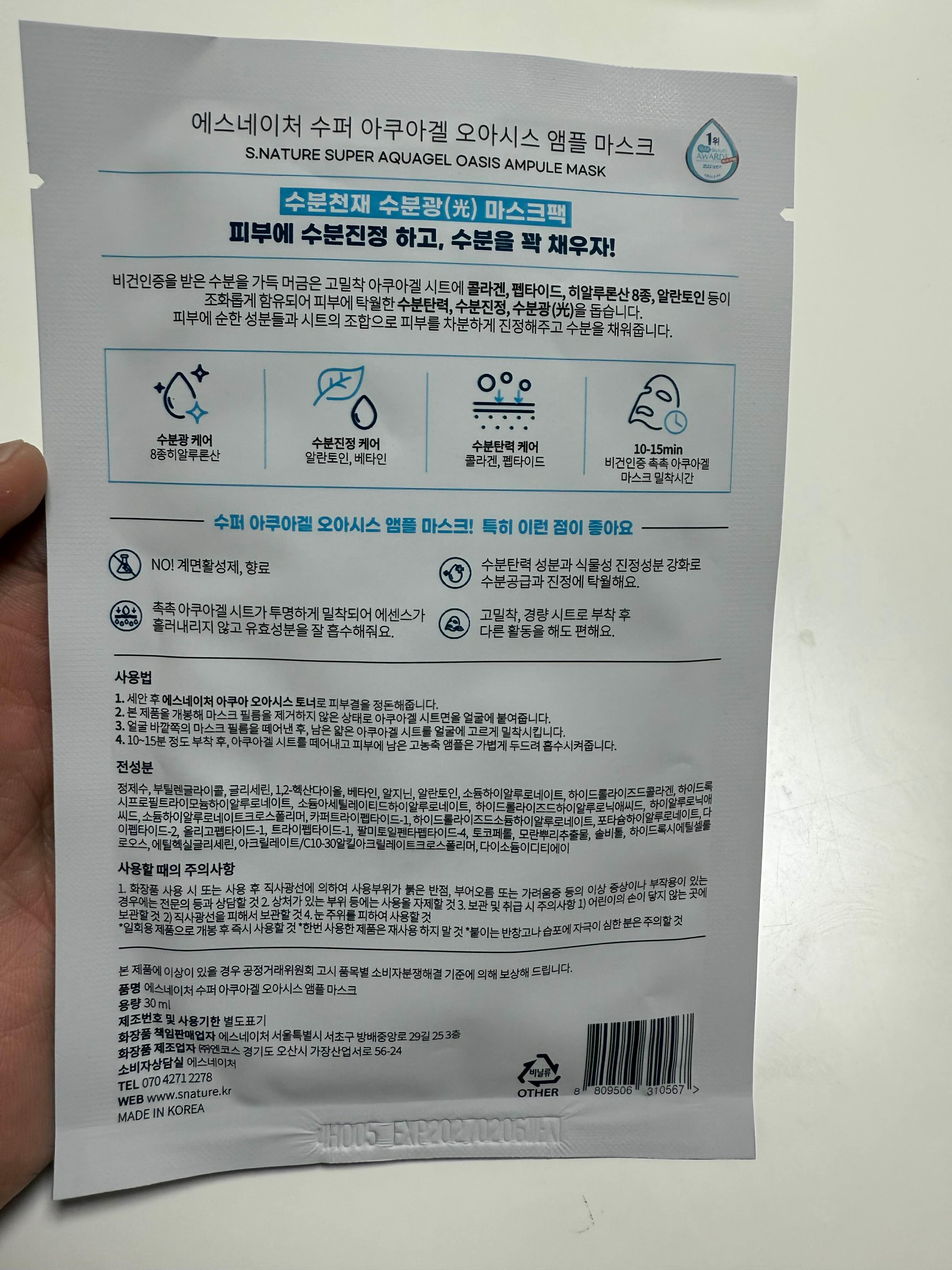 • 제품명: 에스네이처 수퍼 아쿠아겔 오아시스 앰플 마스크 (1매)